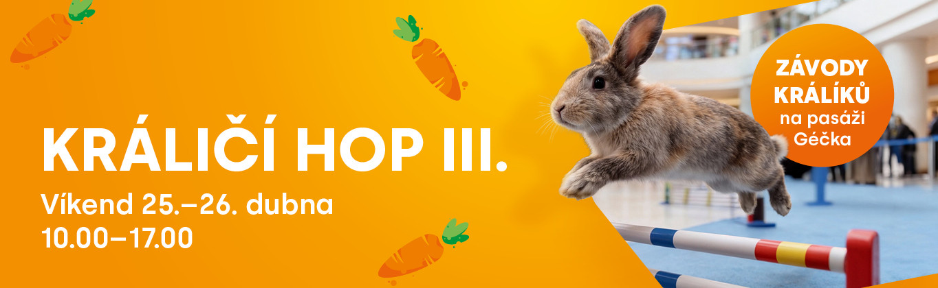 Bienále králičího hopu se vrací do Géčka! Již potřetí přivítáme závodní králíčky na naší pasáži. Součástí akce budou také tvořivé dílničky pro děti.