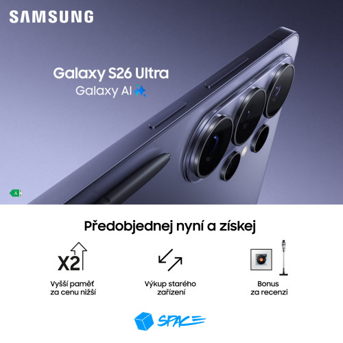 Samsung představil novou řadu Galaxy S26. A tentokrát nejde jen o drobnou evoluci. Tohle je skutečný skok do budoucnosti. Nové modely jsou neuvěřitelně tenké, skvěle padnou do ruky a zároveň si zachovávají vysokou odolnost. Elegantní vzhled se tak potkává s praktickou stránkou. Co nás na novinkách zaujalo nejvíc? Privacy Display u S26 Ultra Funguje podobně jako ochrana displeje u bankomatu – vy vidíte obsah jasně a zřetelně, ale kdokoli vedle vás uvidí jen tmavou plochu. Navíc si funkci aktivujete jen tehdy, když ji opravdu potřebujete – například při práci s bankovní aplikací. GALAXY AI: S telefonem si popovídáte – a česky Nová generace Galaxy AI posouvá práci s telefonem zase o úroveň výš. Součástí je i prostředí One UI 8.5 (Android 16), které je chytřejší, intuitivnější, a ještě víc se přizpůsobí vašim potřebám. NAVÍC: Bonus pro první majitele Nepromeškejte start prodeje a využijte skvělých bonusů. Nabídka platí do 10. 3. 2026. 👉 Zastavte na prodejně pro svojí novou Galaxy S26. 🔗 Kompletní nabídka: ispace.cz/c/novinky-galaxy-s26/